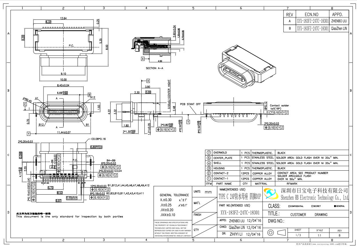 超短體TYPE C 24P防水母座 四腳沉板2.2MM DIP+SMT L=8.0MM 防水IP67(HTC U11尾插)